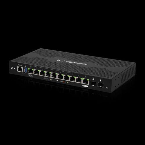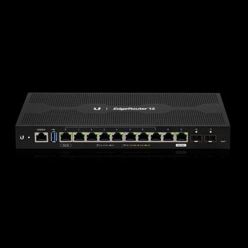 - EdgeRouter ER-12 có khả năng chịu tải 600 user đồng thời. Với 10 cổng RJ45 và 2 cổng SFP có thể chuyển đổi WAN và LAN linh hoạt nên thiết bị có thể cân bằng tải cho phép cộng gộp băng thông tối đa 11 đường truyền internet.