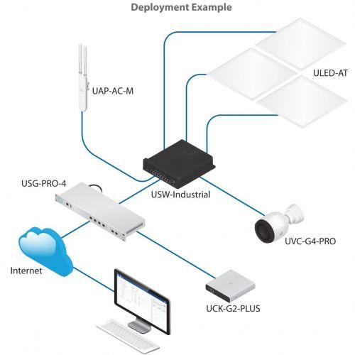 UniFi Switch Industrial có thể cấp nguồn cho nhiều thiết bị khác như UniFi Access Point, UniFi Video Camera G4 Pro và nhiều tấm đèn led chiếu sáng (UniFi Led).